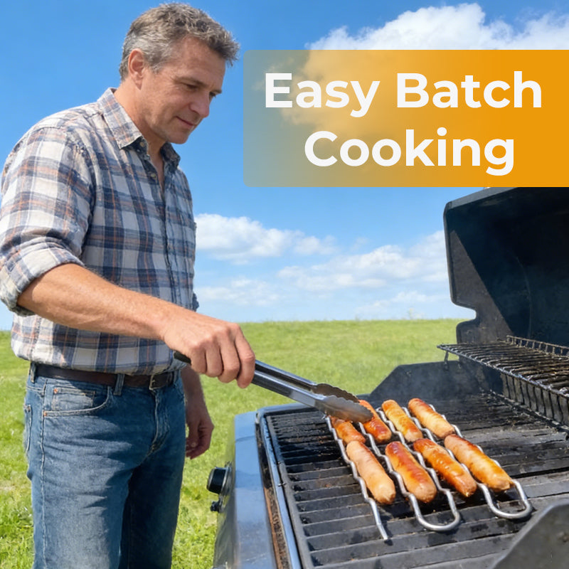 Why flip one by one? This rack holds multiple sausages at once (up to 5 as seen in the pic!). With a simple push of your tongs, you can rotate all of them simultaneously. It saves time, saves space, and ensures everyone gets fed at the same time.